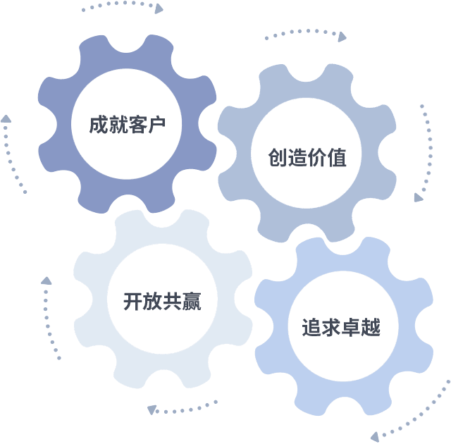 成就客户是一切决策的出发点,,,,创造价值是衡量所有工作的标准,,追求卓越是我们做事做人的态度,,,,开放共赢是我们的格局也是最终的结果。。。价值观的齿轮环环相扣,,,,推动着组织里的每个人不断向前。。。。