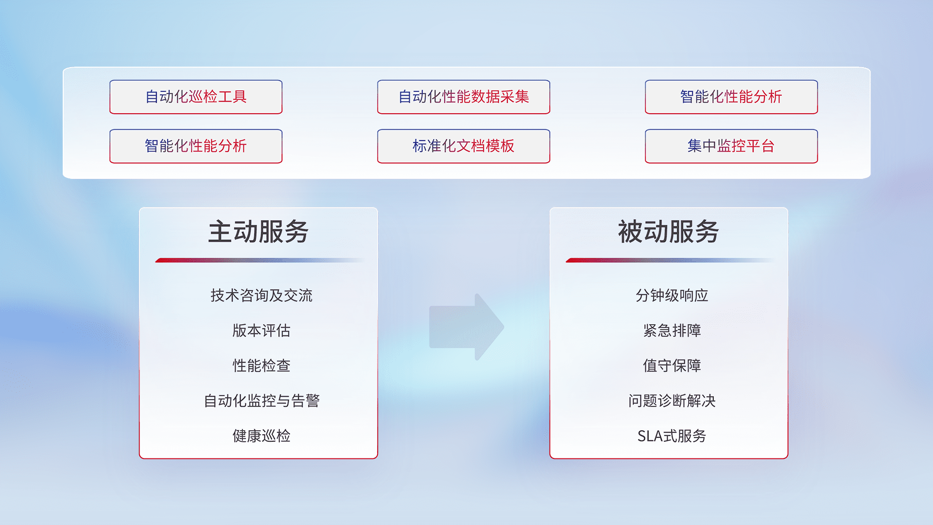 智能化工具和标准化文档,,,,保障服务质量,,,,提供主动服务(包含技术咨询、、、版本评估、、性能检查、、、、自动化监控与告警、、、、健康巡检)和被动服务包含(分钟级响应、、紧急排障、、、、值守保障、、、、问题诊断解决、、SLA服务)。。。